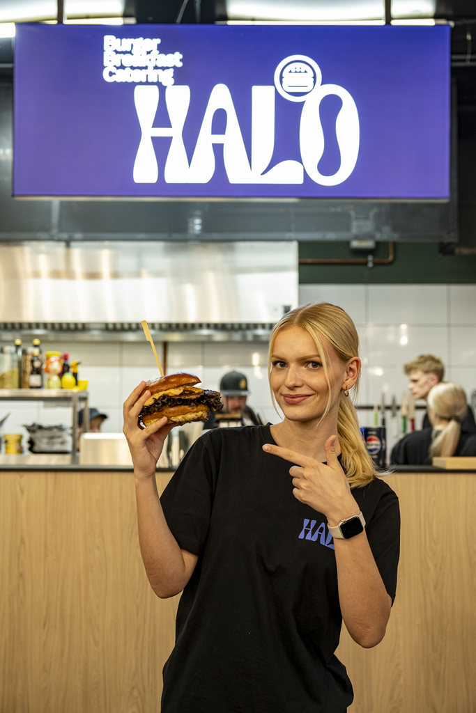 Wołowina (2× 100g), bekon, cheddar, karmelizowana cebula, pikle, pomidor, sałata, sos Jäger